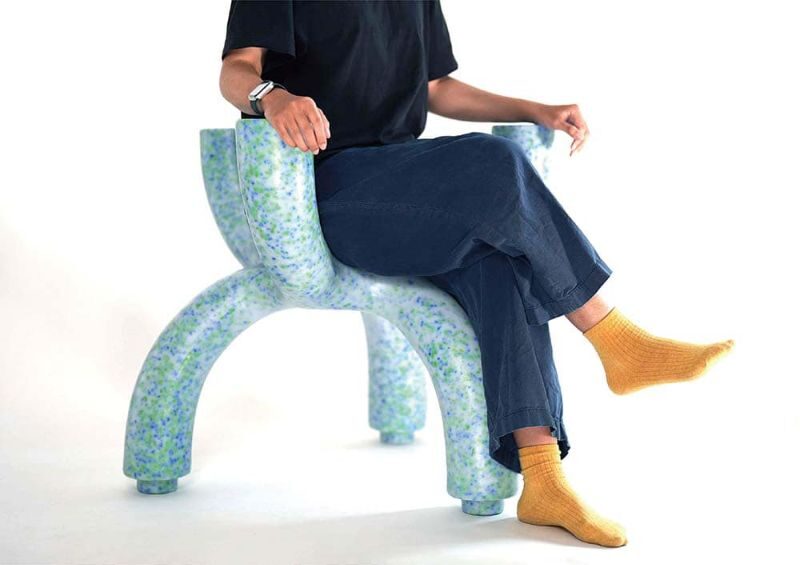 The Coral Chair is crafted from recycled “waste toys” and features a dual-sided design with varying heights. One side offers low chair legs suitable for children, while the other side provides taller chair legs for adults. The chairs can be stacked to create large shared seating arrangements.